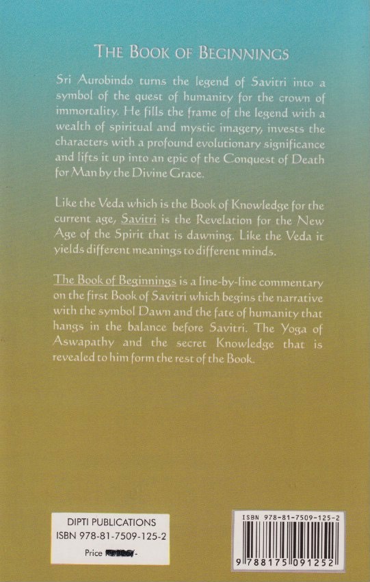 The Book of Beginnings is a line-by-line commentary on the first Book of Savitri which begins the narrative with the symbol Dawn and the fate of humanity that hangs in the balance before Savitri. The Yoga of Aswapathy and the secret knowledge that is revealed to him form the rest of the Book.
