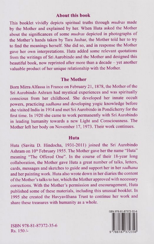 This booklet vividly depicts spiritual truths through mudras made by the Mother and explained by her. When Huta asked the Mother about the significances of some mudras depicted in photographs of the Mother’s hands taken by Tara Jauhar, the Mother told her to try to find the meanings herself. She did so, and in response the Mother gave her own interpretations. Huta added some relevant quotations from the writings of Sri Aurobindo and the Mother and designed this beautiful book, now reprinted after more than a decade – yet another valuable product of her unique relationship with the Mother.